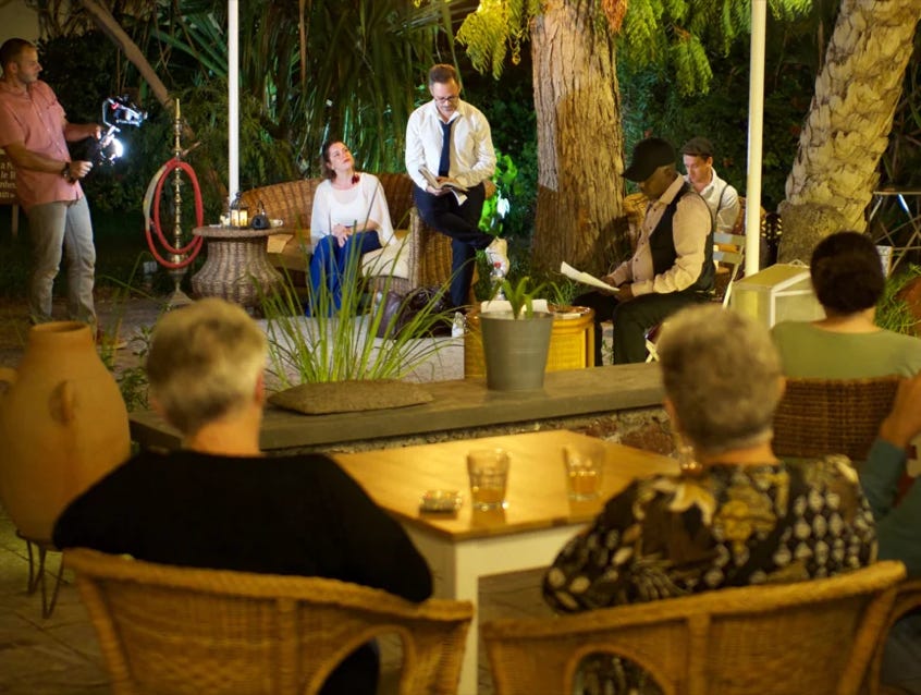 Ce spectacle se réinvente sans cesse au gré de nos voyages, de nos rencontres, des lieux que nous investissons pour l’occasion… Nous le construisons avec vous pour mettre à l’honneur des auteurs français mais aussi des auteurs du pays qui nous accueille. Nous invitons un artiste local à nous accompagner sur scène en musique et en chansons.