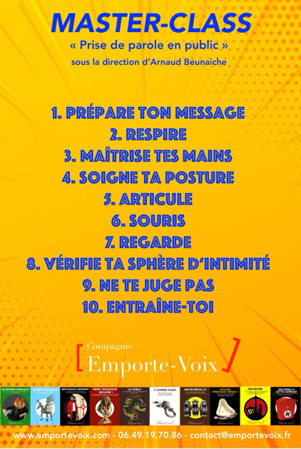 « Ces master-class permettent aux élèves de s'exercer à la prise de parole en public pour les préparer aux différentes épreuves orales de leur cursus scolaire : oraux de stage de 3ème, préparation aux oraux du brevet et du baccalauréat... Je recommande vivement le travail d'Arnaud BEUNAICHE et de la Compagnie Emporte-Voix. »