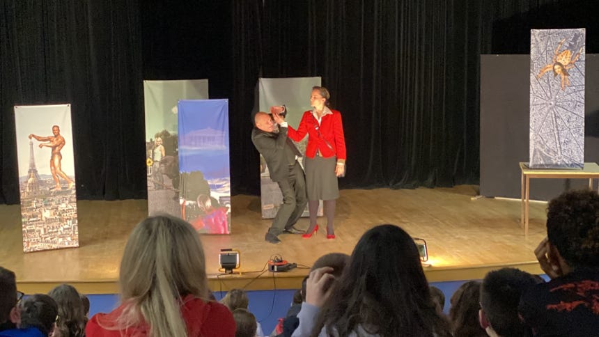 A travers des oeuvres picturales très originales, les comédiens sous les traits de Zeus, Héra, Mélodie, Edouard et Antoine, racontent et interprètent les grands personnages, monstres, lieux, héros et épisodes de la mythologie avec, notamment les douze travaux d’Hercule, l’Olympe et ses dieux, Orphée et Eurydice, les Enfers (avec Sisyphe, Tantale, les Danaïdes), Arachné, Léda…